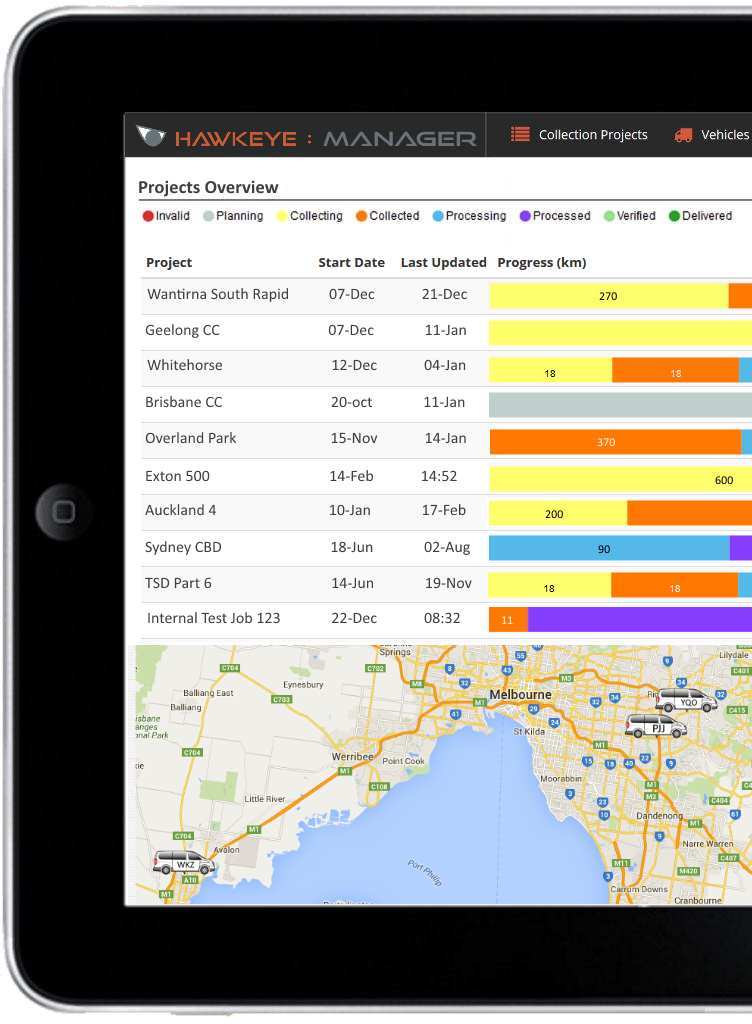 With existing hardware already installed in your Hawkeye survey equipment and an internet connection, Hawkeye Manager not only tracks the location of your vehicles, but also provides real time status updates and survey verifications.