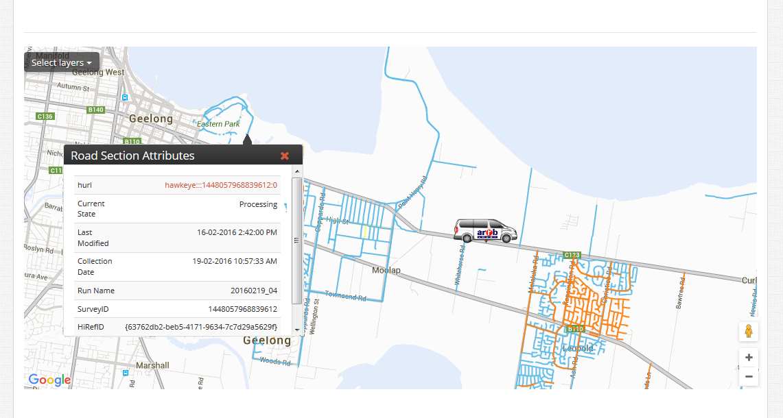 Vehicle location data is constantly streamed to the website, allowing for GPS information to be displayed along with the survey routes that have been collected and processed.